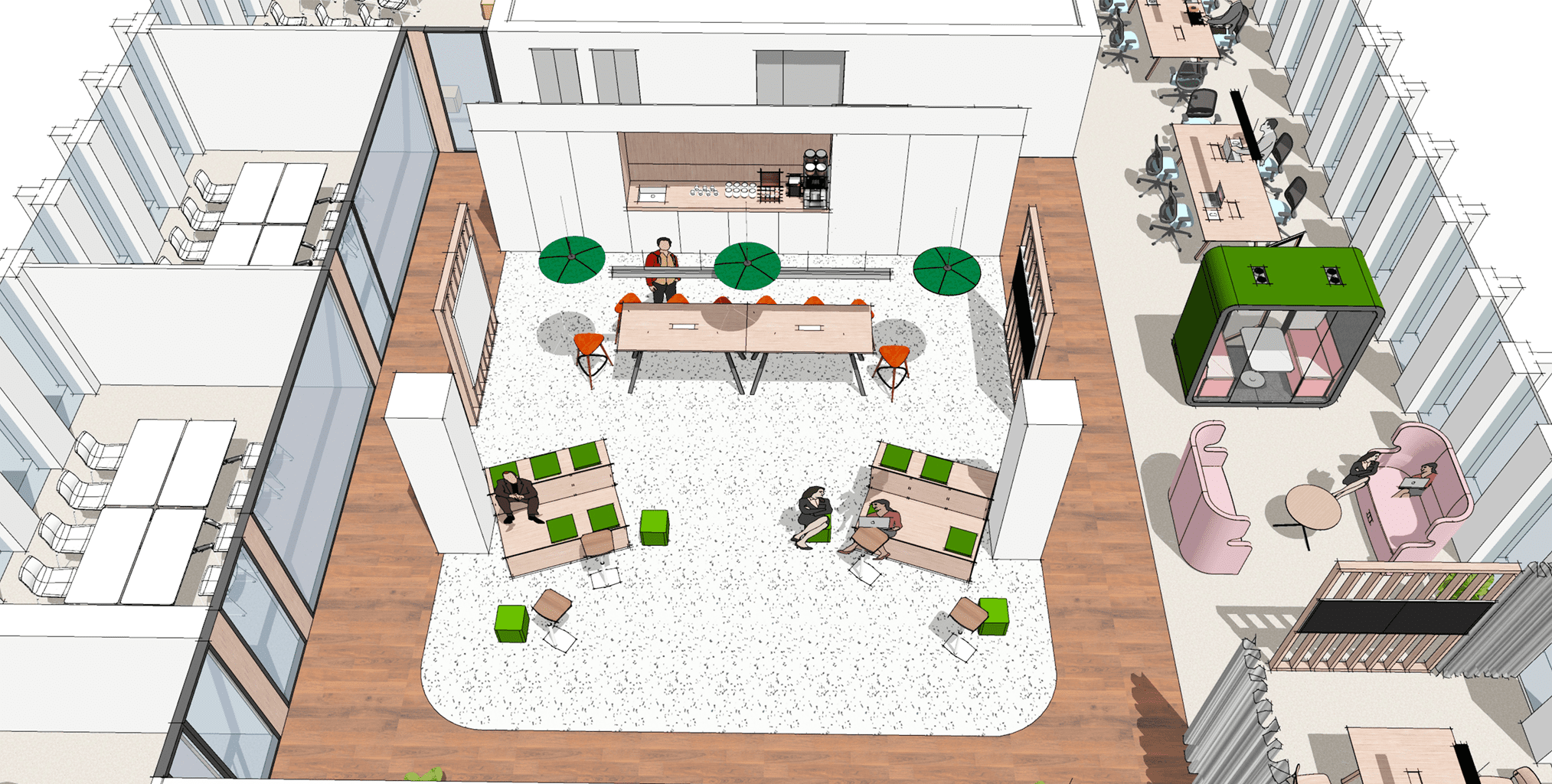 Il a fallu imaginer une compilation des différents modes de collaboration possibles dans un espace de travail. Un soin particulier est apporté à la modularité et l’hybridation des espaces. Pour offrir un lieu de collaboration, de création et d’accueil. Le tout organisé autour de l’AGORA qui sera le lieu de vie commun et fédérateur de l’ensemble des intervenants.